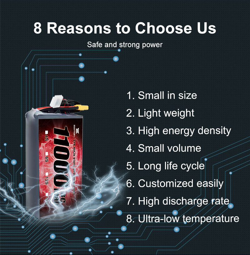 Produtos de alta qualidade: Nossas baterias são reconhecidas por sua tecnologia e desempenho superiores, incluindo nossosfabricante de bateria de estado sólido bateria de estado sólido de alta densidade de energia 11000mah 5c 10c 3s6s baterias drone, projetado para atender às altas demandas de aplicações de drones.